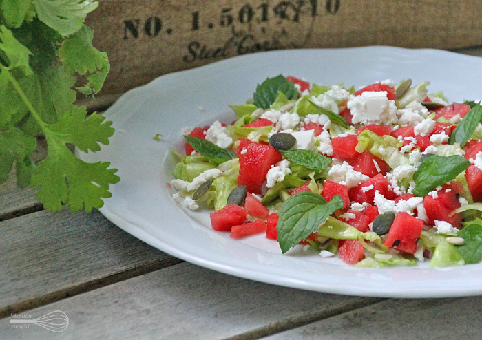 - Kuori ja pilko vesimeloni lohkoiksi. Pese ja revi salaatti. Murenna feta.