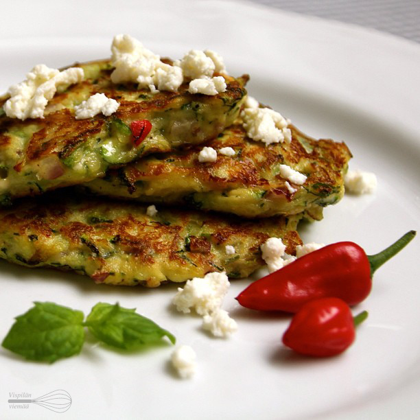 Kesäkurpitsapihvit saivatkin tällä kertaa makua chilin lisäksi fetasta ja mintusta. Ja mikä parasta, näiden teossa ei nokkakaan turhan kauan tuhise, joten hellan ääressä malttaa seistä helteelläkin juuri sen tovin.