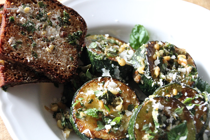 Alkuperäisessä reseptissä paistetut kesäkurpitsat nautittiin vaalean leivän ja itse tehdyn ricottajuuston kanssa, mutta itse päädyin maalaislimppuun, jonka siivut kastoin pannun pohjalta löytyvään aromaattiseen seokseen. Täydellistä, varsinkin kun paistettujen kesäkurpitsojen päälle ripottelin vielä tuoreita yrttejä sekä parmesanjuustoa. Teen ehdottomasti toistekin!