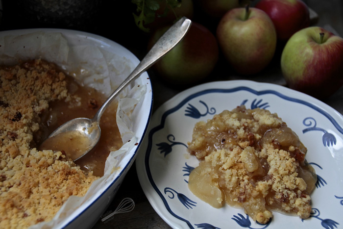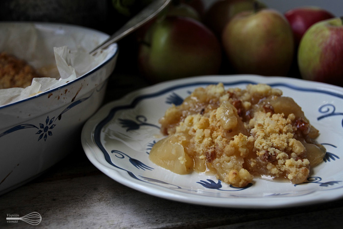 - Levitä täyte omenaseoksen päälle ja paista uunissa noin 45 minuuttia, kunnes pinta on kullanruskea ja omenat pehmeitä.