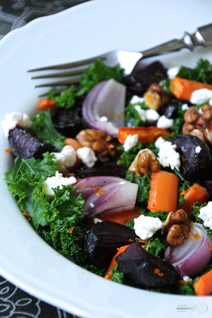 Olen tehnyt tätä salaattia milloin mitenkin varioiden. Esimerkiksi juurekset ovat vaihtuneet saatavilla olevien mukaan; punajuuren ja porkkanan sekaan on joskus eksynyt yksinäinen peruna, tai porkkana on vaihtunut keltajuureen. Toisinaan olen vastaavasti keittänyt juurekset kokonaisina, mutta joskus juurekset on tullut paahdettua kuorittuina ja paloiteltuna. Punajuuren, fetan, saksanpähkinän ja appelsiinin (tai greipin) kuoren yhdistelmästä pidän tämän salaatin kohdalla kuitenkin kynsin ja hampain kiinni. Toimii!