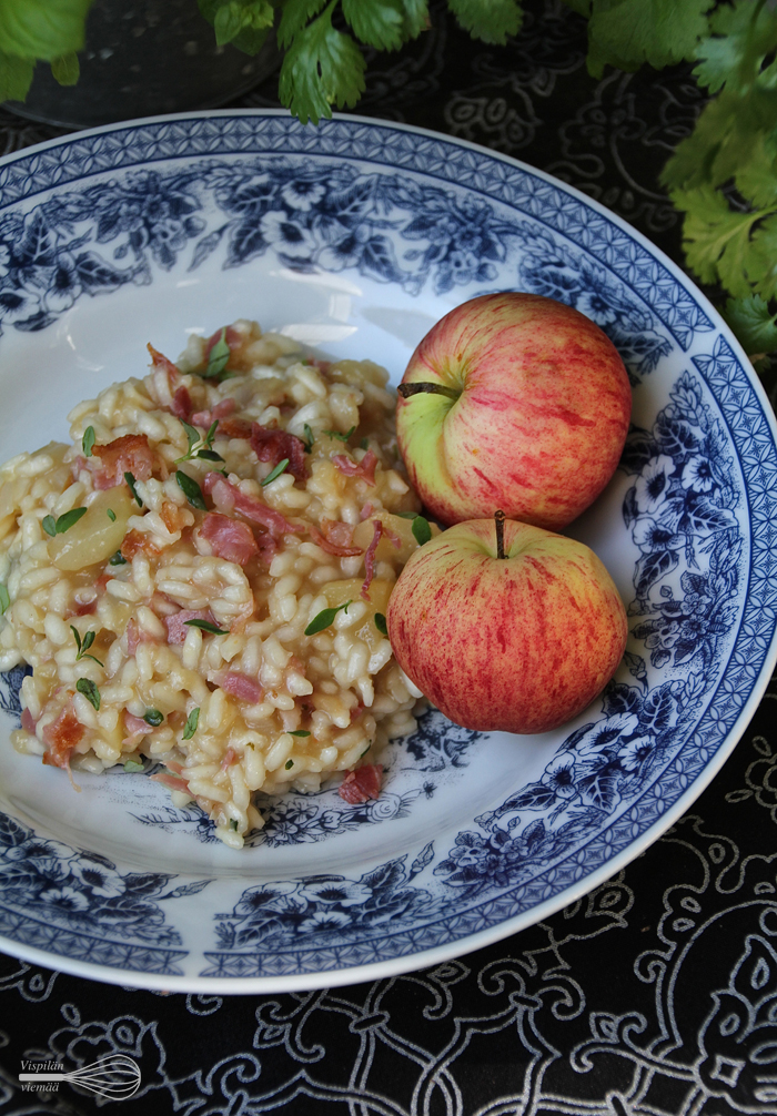 Omenasosetalkoiden jäljiltä oli vielä muutama omena, joten päässä alkoi pyöriä ajatus omenarisotosta – ja että pekonista saisi omenalle hyvän kaverin. Ei muuta kuin kaupasta pekonia ostamaan, kenties ensimmäistä kertaa tällä vuosituhannella. Mutta onneksi ostin, sillä lopputulos oli vertaansa vailla.