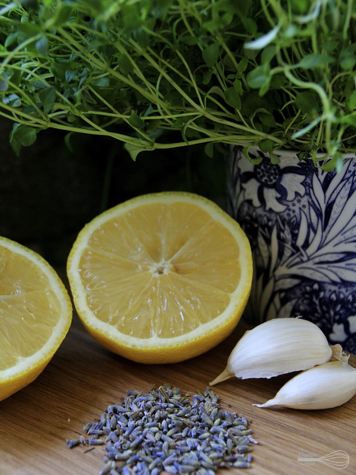 Ja tuoksuista laventelikanassa onkin pitkälti kyse. Jo marinadia tehdessä mieli piristyy, kun sitruuna, hunaja, timjami, valkosipuli ja laventeli kohtaavat toisensa. Mitkä aromit!