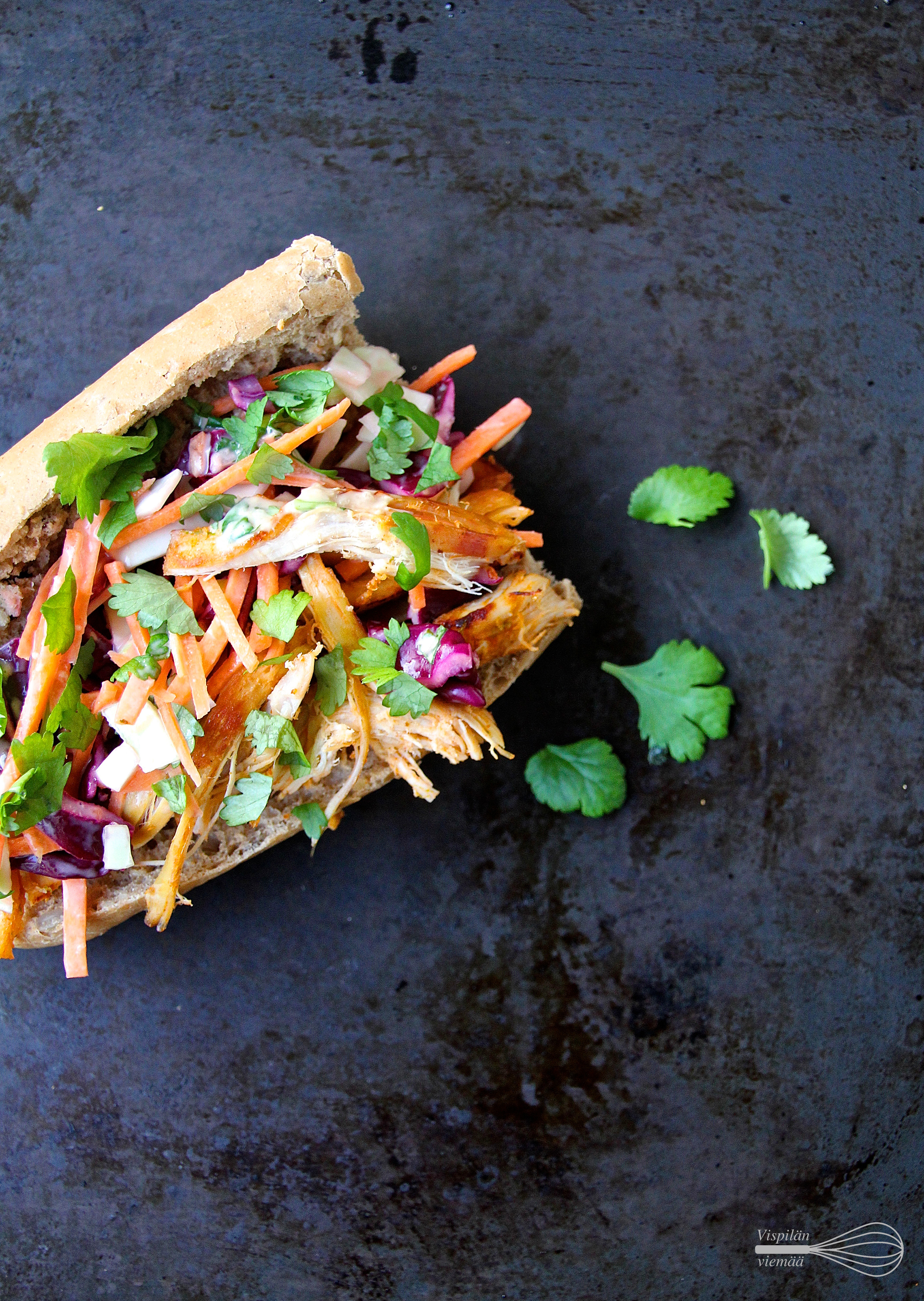 - Levitä lihat, kasvikset ja kastike halkaistujen patonkien väliin. Ripottele päälle vielä tuoretta korianteria.
