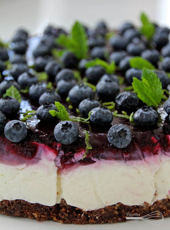 Ja siis todettakoon heti alkuun, ettei mustikkakeitosta ole kiilteeksi. Antaa väriä, mutta ei makua. Tuli se siis tässä yhteydessä testattua, ja saman tein pudotettua reseptistä pois – samaan aikaan kun kaivoin pakkasesta mustaherukat esille. Ja jo alkoi lyyti kirjoittaa, kuten sanotaan. Toimi. Niin toimi myös sulatettu suklaa keksimurskan seassa siinä kuin limetti ja rahka täytteen raikastajina. Kaiken kaikkiaan oikein oiva makukimara.