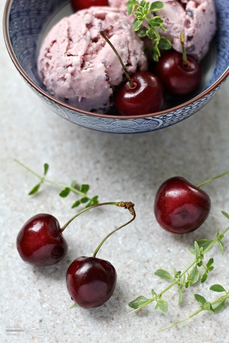 Kaikki sai alkunsa siitä, kun ostin kirsikoita. Tarkoituksena oli nauttia ne sellaisenaan, mutta sitten silmäni osuivat parvekkeella kukoistavaan (sitruuna)timjamiin. Ja kun mieleeni muistui vielä pakkasessa nököttävä jäätelöpaketti, päässäni loksahti: kirsikka ja timjamihan saattaisivat sopia yhteen ja maustaa jäätelön. Ei siis muuta kuin tuumasta toimeen, kohti uusia makututtavuuksia. Ja mikä tuttavuus!