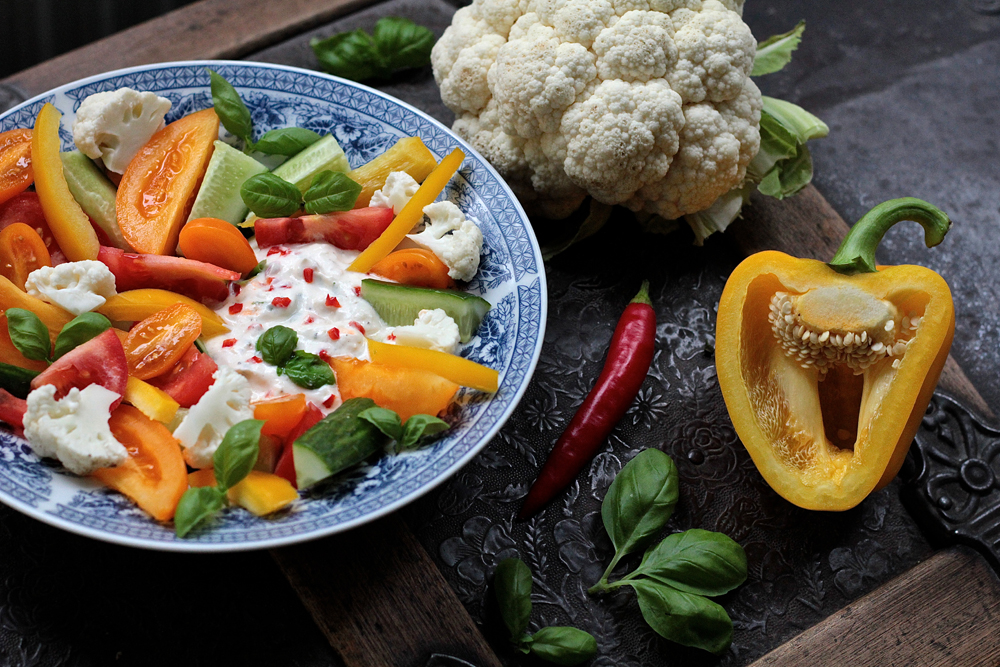 Satokauden kasvikset ja chili-jogurttidippi, herkullinen ja kevyt lisuke tai vaikka leffaillan purtava.