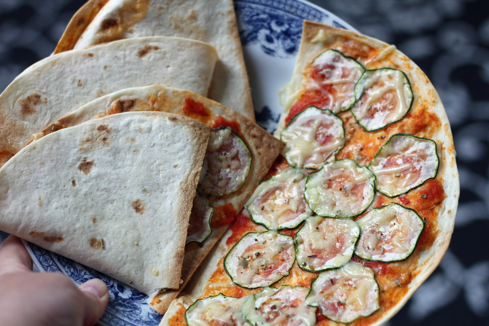 Ja tosiaan, jos ei taikinan pyöritys ole leipälajisi tai muuten vain on tuli hännän alla: Puolita tortillat, levitä ainekset päälle ja paista noin viisi minuuttia. Nauti rapeaksi paistuneet tortillapizzat kaksinkerroin taitettuina: