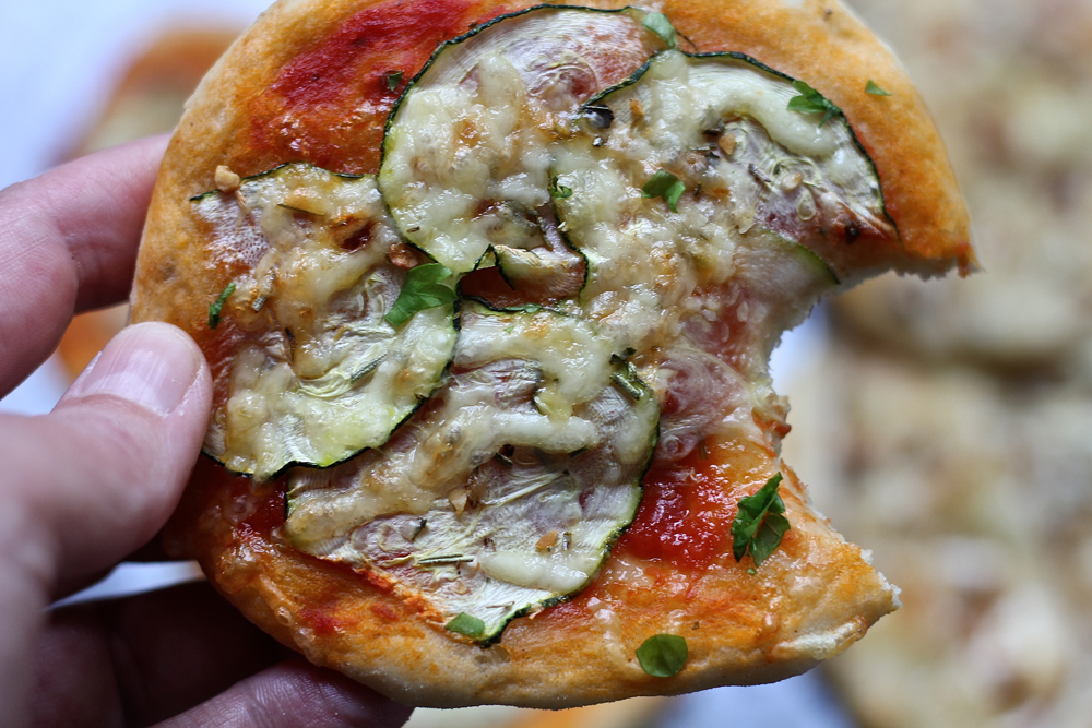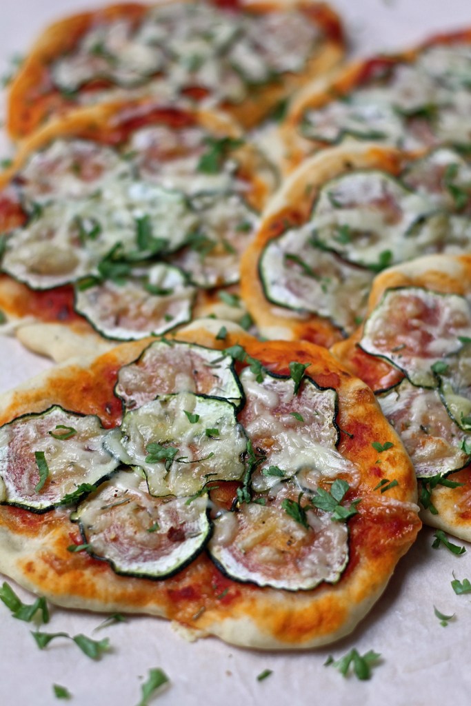 - Levitä pizzapohjien päälle valmista tomaattikastiketta, sitten ohuet kesäkurpitsaviipaleet, ripaus maustetta ja juustoraastetta.