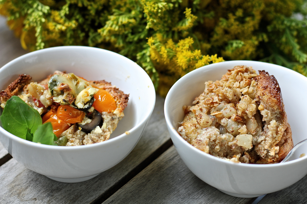 (Itse käytin silikonimuffinivuokaa, jonka kastelin kylmällä vedellä ennen täyttämistä.) - Täytä suolaisella munamaidolla vuoratut vuoat kasviksilla ja vastaavasti makealla munamaidolla vuoratut omena-kaneliseoksella.