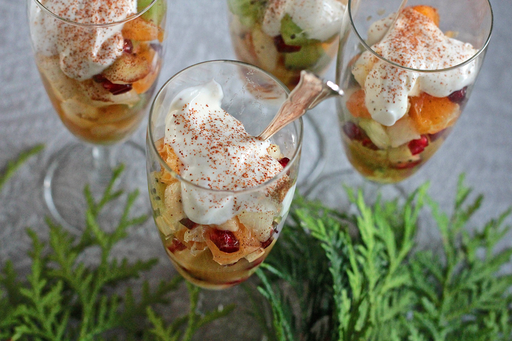 Tarjosin ystävilleni jouluhenkisen brunssin merkeissä jälkiruoaksi muun muassa tätä hedelmäsalaattia, joka saa makua kanelilla maustetusta liemestä ja jogurtista. Toimii.