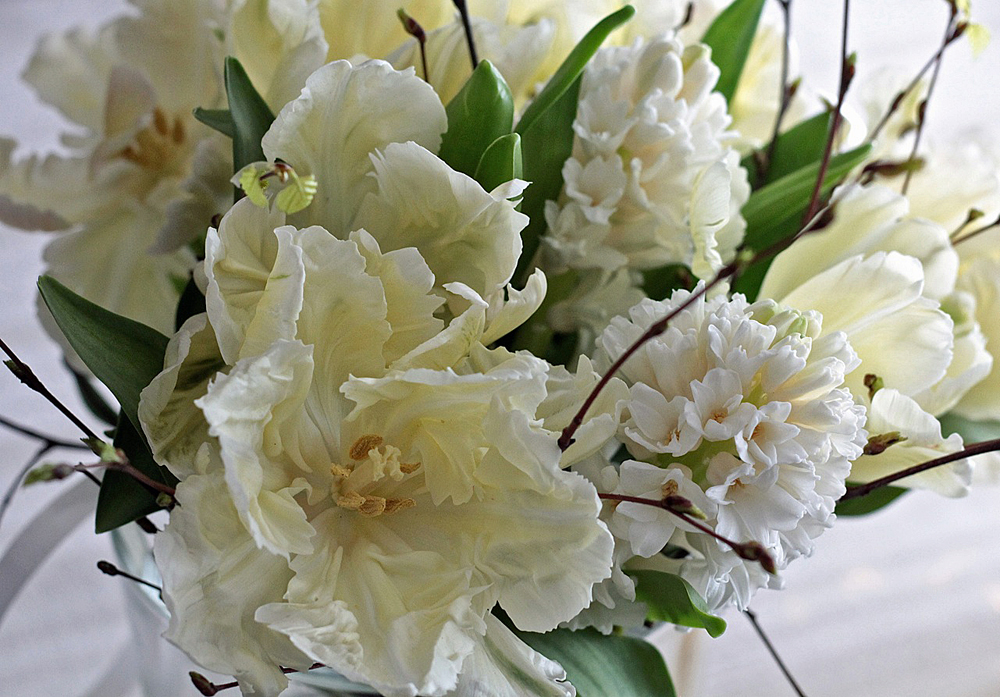 Yhtä lailla suosittelen kukkien yösäilytystä viileässä! Olen nimittäin lähes viikon ihaillut kukkia, jotka ostin torilta. Upeina ovat pysyneet, kun olen pakannut aina yöksi jääkaappiin (tai parvekeovien väliin jäävään viileään rakoon). Esimerkiksi kuvan tulppaani-hyasintti-kimpun varret käärin ensin kosteaan liinaan ja sitten sujautin kimpun muovipussissa jääkaappiin.