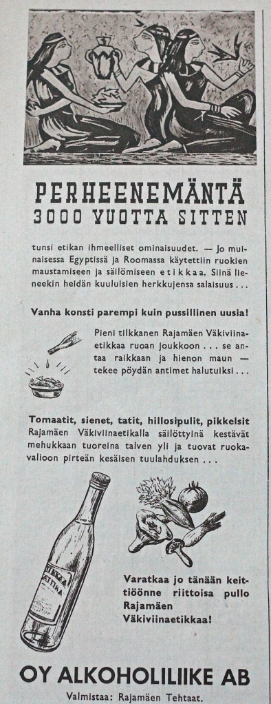 PS: Joskus on hauska selata vanhoja lehtiä ja katsoa, miten silloin on mainostettu milloin mitäkin. Nyt käsiini osui Kotiliesi -lehti vuodelta 1949 (nro 17), jossa Rajamäki mainosti etikkaa vedoten 3000 vuotta sitten eläneisiin emäntiin.