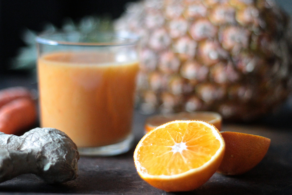 Pian käsissä on raikkaan herkullinen smoothie, johon inkivääri antaa potkua – kuin suoraan päälle pyrkivän flunssan persuksiin. Smoothieta ja lepoa, kyllä se tästä.