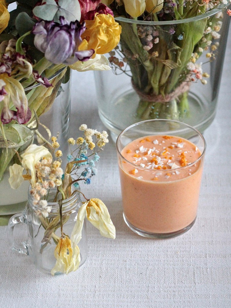(Päälle: raastettua kurkumaa ja kookosta lastuina)