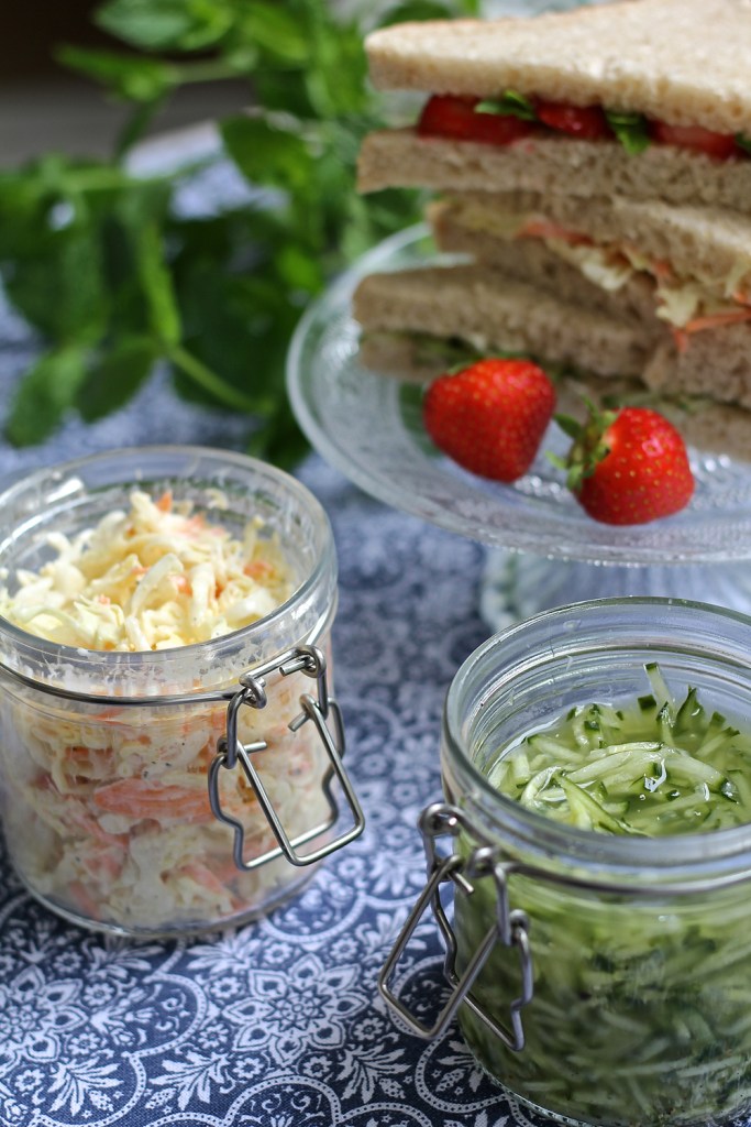 Tällä kertaa leipien väliin sujahti kirpakkaa kurkkusalaattia sekä coleslaw-salaattia, jota terästin ripauksella chilirouhetta. Niin ja appelsiinimarmeladia, mansikkaa ja minttua.