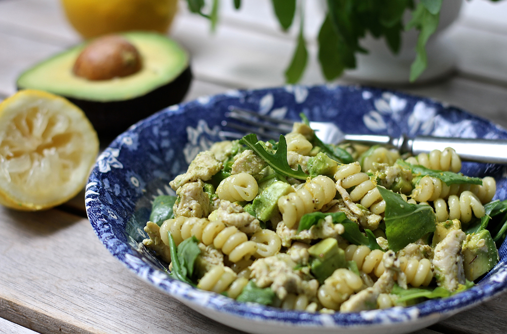 Tällä kertaa pasta sai makua erityisesti sitruunasta ja pestosta. Avokado ja broilerit lisäävät ruokaisuutta, lisäksi joukkoon sopisi niin paahdetut pinjansiemenet kuin Pecorino -juusto.