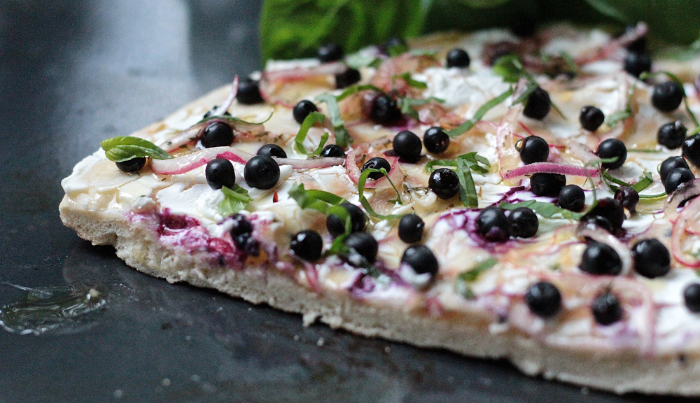 Itse päädyin käyttämään helposti levitettävää vuohenjuustoa, sellaista pehmeää, purkista levitettävää. Kesäjuhlista oli jäänyt hieman marinoituja punasipuleita ja basilika kukoisti parvekkeella, joten niitä sitten mustikoiden lisäksi. Ja mikäli haluaa täydentää suolaisen ja makean liittoa, päälle vielä ohuelti juoksevaa hunajaa.