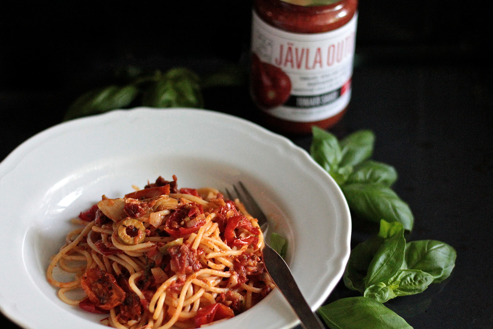 Tämä ei ole maksettu mainos, vaikka kuvan taustalla näkyykin Jävla Sås Bolagin purkki Jävla Outo, jonka kyljessä lukee: ”Tomaatit, jotka ovat liian erilaisia mahtuakseen EU-standardeihin, mahtuvat Jävla Sås Bolad -pulloihin.” – Hienoa, epämuodostuneille tomaateille on vihdoin löytynyt paikka! Tosin, eihän niitä ole ennenkään pois heitetty. Tomaattimurskapurkeissa niitä on varmasti ollut ennenkin, mutta eipä ole ennen taidettu sanailla tuohon tapaan purkin kyljessä. Nyt nimittäin samassa etiketissä yhdistyy EU, erilaisuus ja koulukiusaaminen. Toisin sanoen etiketin teksti jatkuu: ”Tee hyvää. Tue koulukiusaamisen vastaista työtä. Lahjoitamme kampanjan ajan Jävla Sås Bolog -tomaattikastikkeen myyntituotot lyhentämättömänä Mannerheimin Lastensuojeluliitolle.” Koulukiusaamisen vastaiseen työhön.