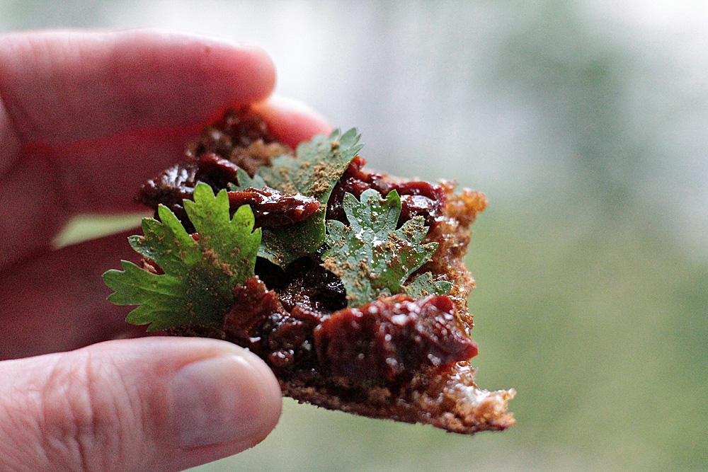Ruissipsin päällä, esimerkiksi pienenä alkupalana, toimii myös aurinkokuivattu tomaattisiivu, jonka päällä on hieman tuoretta korianteria sekä ripaus lakritsijauhetta.