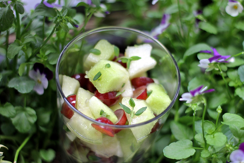 Tuore minttu on hedelmäsalaatin vanha tuttu. Sitä on tullut lisättyä hedelmäsalaattiin kerta toisensa jälkeen. Harvemmin timjamia, olkooonkin että se on saanut maustaa tuunatun kirsikka-timjamijäätelön kerran jos toisenkin. Nyt kuitenkin sain päähäni yhdistää timjamia galiamelonin ja rypäleiden sekaan. Toimi, kuten myös limetin ja appelsiinin mehut sekä raastetut kuoret. – Esimerkiksi loraus limetin mehua ja hieman raastettua limetin kuorta tekevät ihmeitä vesimelonille. Ja miten herkulliseksi melonisalaatti muuttuu ripauksella chilijauhetta! Chilin lisäksi esimerkiksi tähtianis maustaa hedelmäsalaatin kivasti lakritsaa muistuttavilla aromeilla, kun sitä hieman keitetään hunajan ja mehun kanssa. (Yksi tähtianiksen maustama ohje löytyy esimerkiksi K-Ruoka.fi:n sivuilta.) Eikä pidä unohtaa balsamiviinietikkaa, joka yhdessä sokerin ja tuoreen mintun kanssa saa mansikan maistumaan todella herkulliselta.
