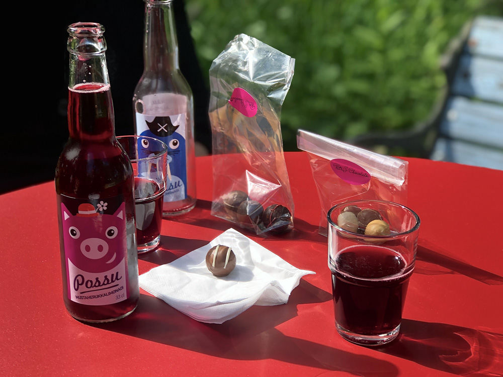 PetriS Chocolate Roomin Bed & Breakfast (kuvat yllä saat klikkaamalla suuremmiksi) sijaitsee entisen koulun tiloissa. Pihamaalta löytyy hurmaava puutarha, jossa voi herkutella samalla kesästä nauttien. Praliinit (kuva alla) maistuivat herkullisilta, mutta niin myös ajatukset mummolaan vievät Honkajoen Panimon Possu- ja Mursu-limonadit, jotka olivat ihanan marjaiset maistuen ja tuoksuen mustaherukalta ja mustikalta. Tällä kertaa en majoittunut Bed & Breakfastissa, mutta kuvat majapaikasta riipputuolilla sekä ajatus paikan aamiaisesta jäivät houkuttelevina mieleen. Ehkä vielä joku kerta…