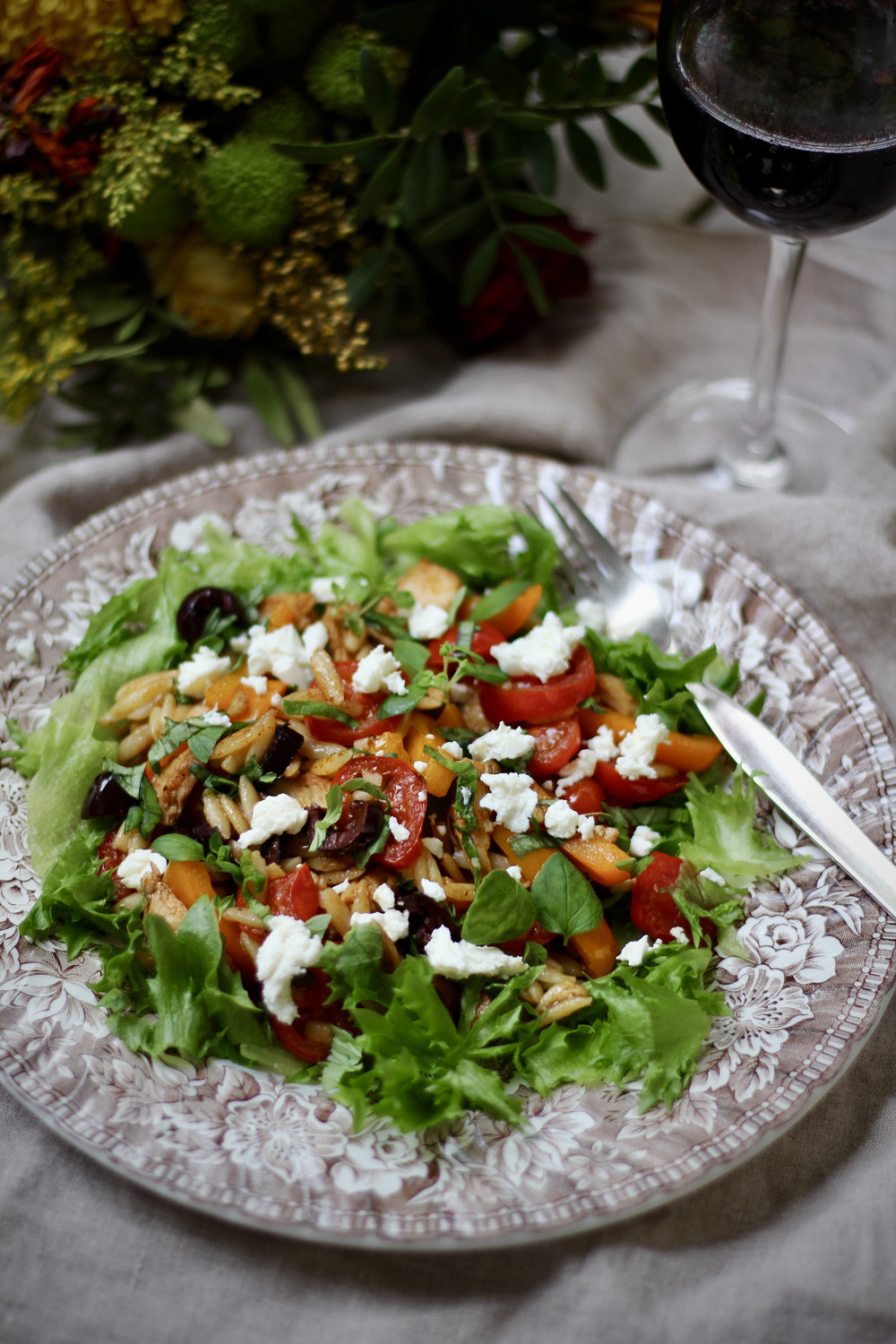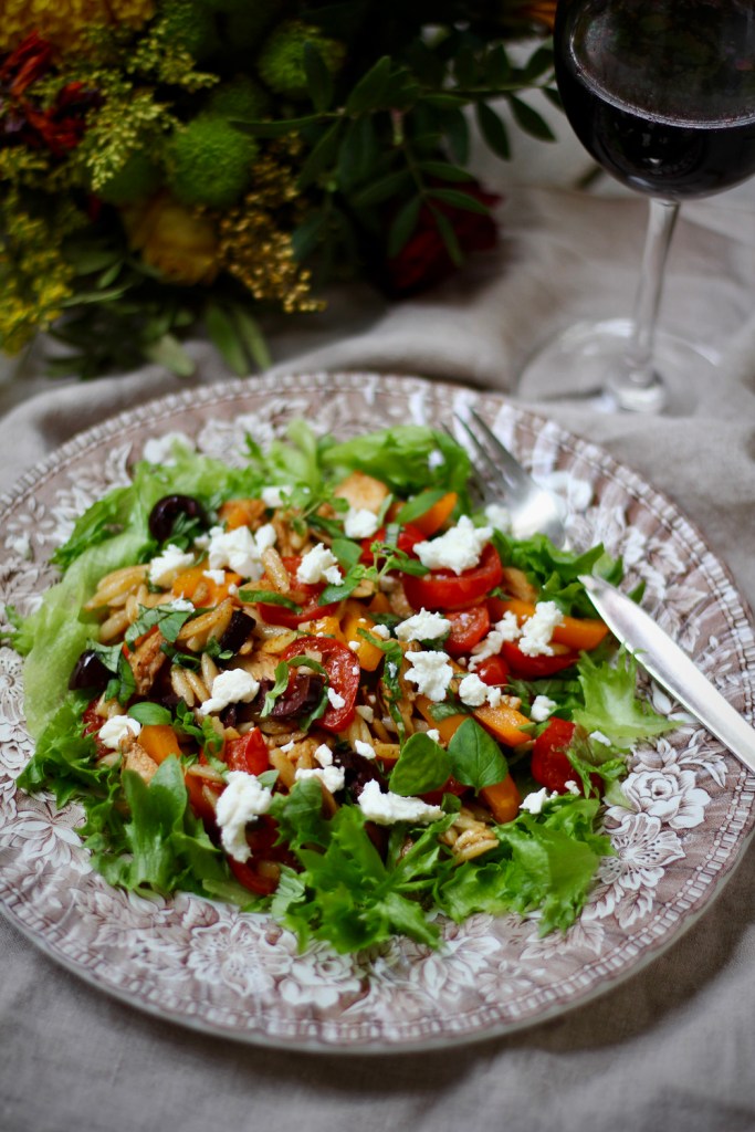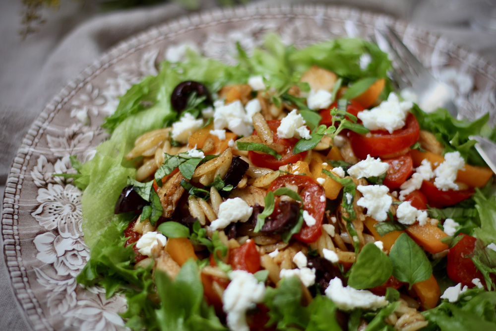 Yhdestä ateriasta oli jäänyt reilu desi kreikkalaisten jyväpastaa (orzo), toisesta jokseenkin saman verran broileria. Sellaisenaan niistä olisi syntynyt melko vaisu ateria yhdelle, mutta kun näiden lisäksi pannulle lisäsi paprikaa, kirsikkatomaatteja ja oliiveja, sekä maustoi nämä hyppysellisellä savupaprikajauhetta, lorauksella balsamicosiirappia sekä lähes kourallisella tuoreita yrttejä, alkoi herkkusalaatti hahmottua. Ei muuta kuin lautaselle salaatinlehtiä (tai rukolaa, jos sellaista löytyy) ja lopulta koko komeuden päälle murennettua fetaa. Jos kotona olisi ollut vielä sitruuna, olisin saattanut raastaa vielä aavistuksen sitruunan kuorta joukkoon.