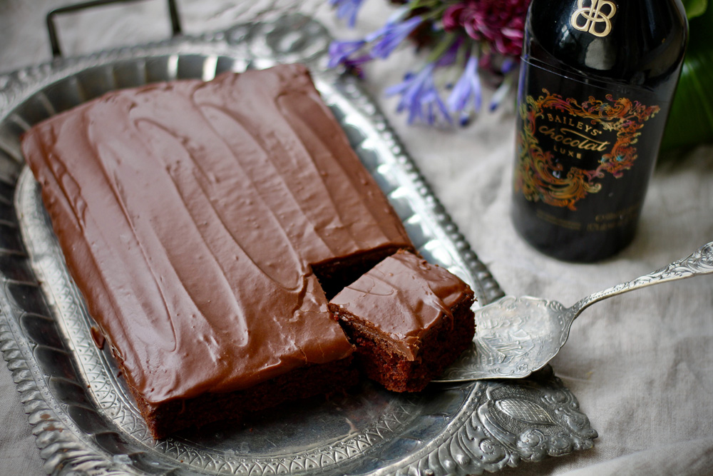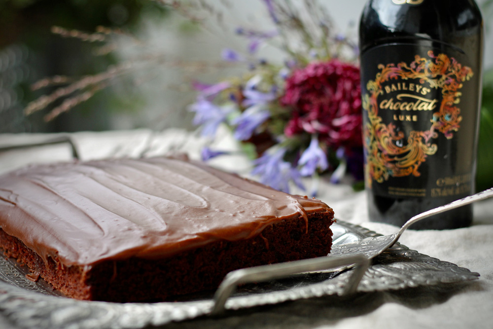 Lopputulos oli ihanan mehevä (varsinkin seuraavana päivänä!) ja Baileys antoi kivan säväyksen. Kuvan tarjotinta varten leikkasin sopivan palan ja kuorrutin palan vasta tarjottimen päällä.