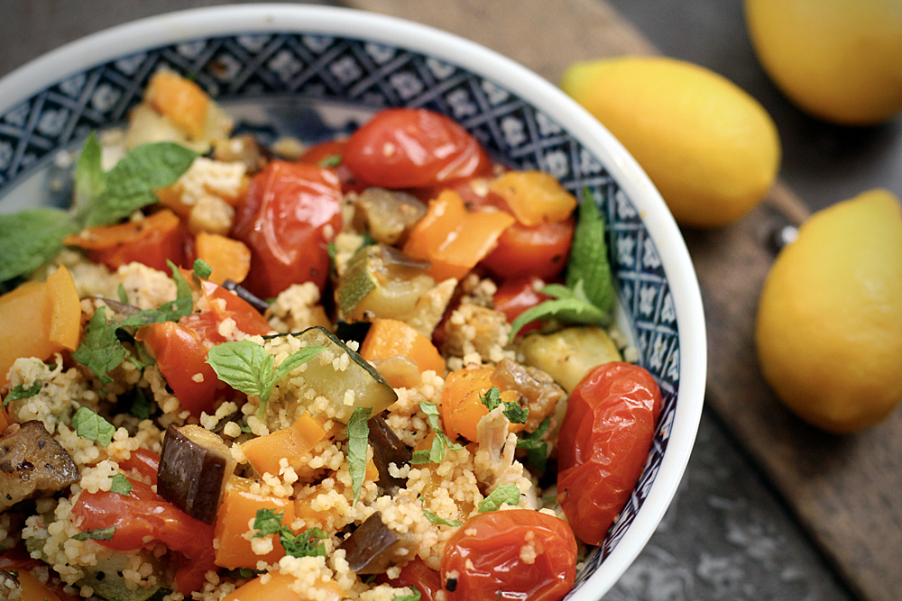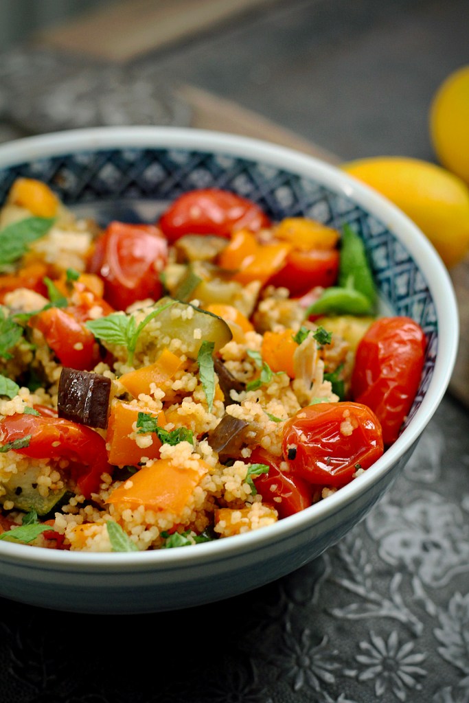 Paahdetuista kasviksista, yrteistä ja sitruunasta syntyy herkullinen couscous-salaatti. Maistuu niin sellaisenaan kuin lisukkeena, lämpimänä ja kylmänä.