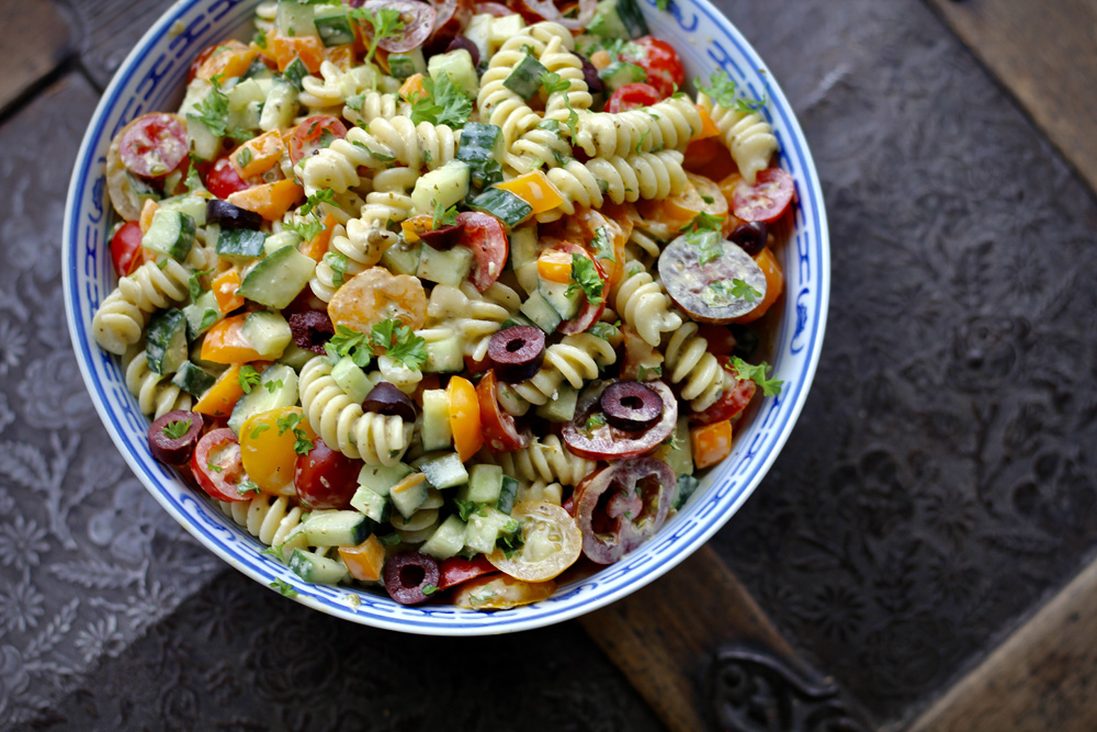 Pasta-pestosalaatti sopii loistavasti niin juhlien seisovaan pöytään, eväsretkelle kuin lounassalaatiksi.