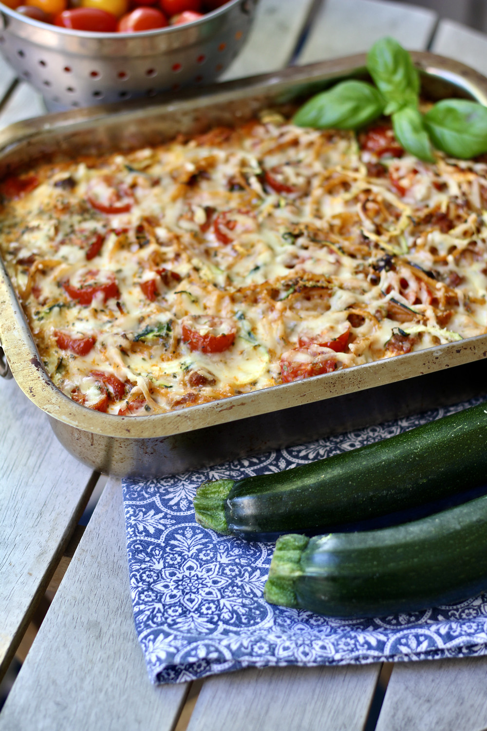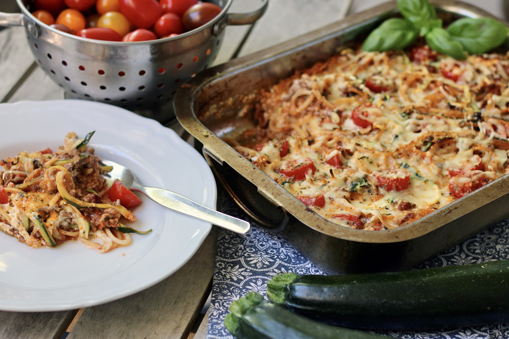 Koulusta tuttu spagettivuoka uudistui, kun osa spagetista vaihtui kesäkurpitsaspagettiin. Lisämakua saatiin niin tuoreista kuin aurinkokuivatetuista tomaateista sekä oliiveista. Perinteisen jauhelihan voi korvata helposti esimerkiksi vegejauhiksella.