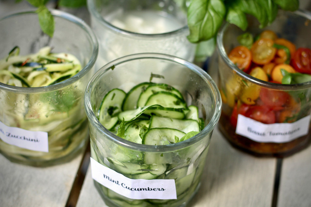 Huuhtele ja pilko kesäkurpitsa haluamallasi tavalla. Itse käytin spiraalileikkuria. Silppua minttu. Sekoita liemen ainekset. Lisää kaikki suljettavaan rasiaan tai purkkiin ja sekoita. Anna maustua hetki jääkaapissa.