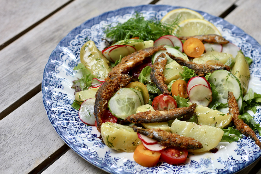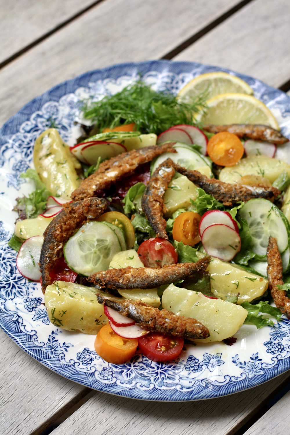 Kesäinen salaatti syntyy uusista perunoista, maukkaista muikuista sekä raikkaista kasviksista. Salaatinkastike, johon makunsa antavat niin sitruuna, hunaja kuin Dijon-sinappi, maustaa myös vastakeitetyt uudet perunat.