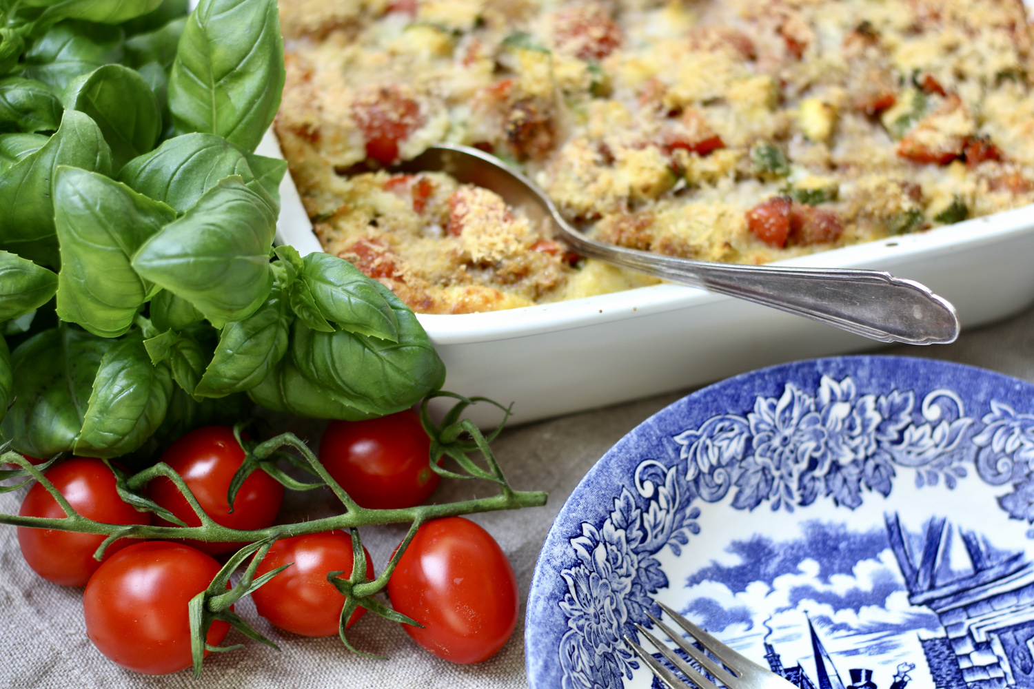 Superhelppo ja maukas perunasoselaatikko syntyy käden käänteessä pakastealtaan perunamuussiaineksista, pestolla maustetuista kasviksista sekä yrttisistä raakamakkarapaloista.