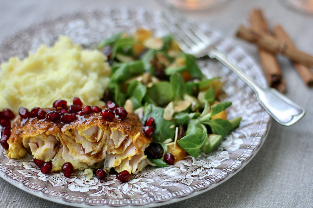 Tällä kertaa kala sai pintaansa erityisesti appelsiinin kuoren raastetta siinä kuin kurkumaa, joka antaa kalalle kauniin keltaisen värin, mutta jolla on myös useita terveysvaikutuksia. Kurkuman kun on todettu esimerkiksi rauhoittavan ärtynyttä vatsaa, alentavan kolesterolia sekä torjuvan matala-asteista tulehdusta. Piparkakkumausteista tutut kaneli, inkivääri, neilikka ja kardemumma täydentävät makuja.