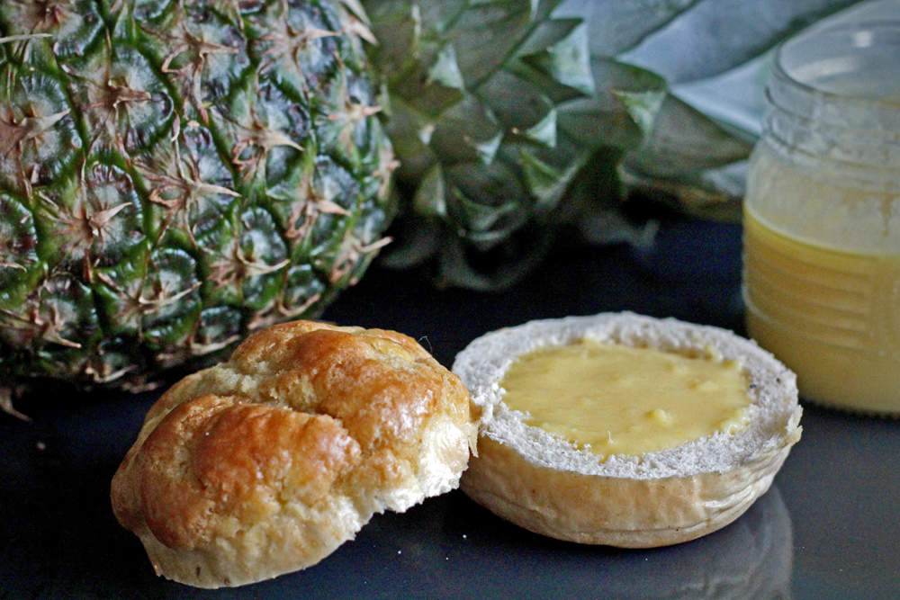 Ananasta muistuttava pinta sai keittämään ananashilloa ja ananastahnaa (Pineapple Curd). Ja koska laskiainen… pursotin väliin vaniljalla maustettua kermavaahtoa.