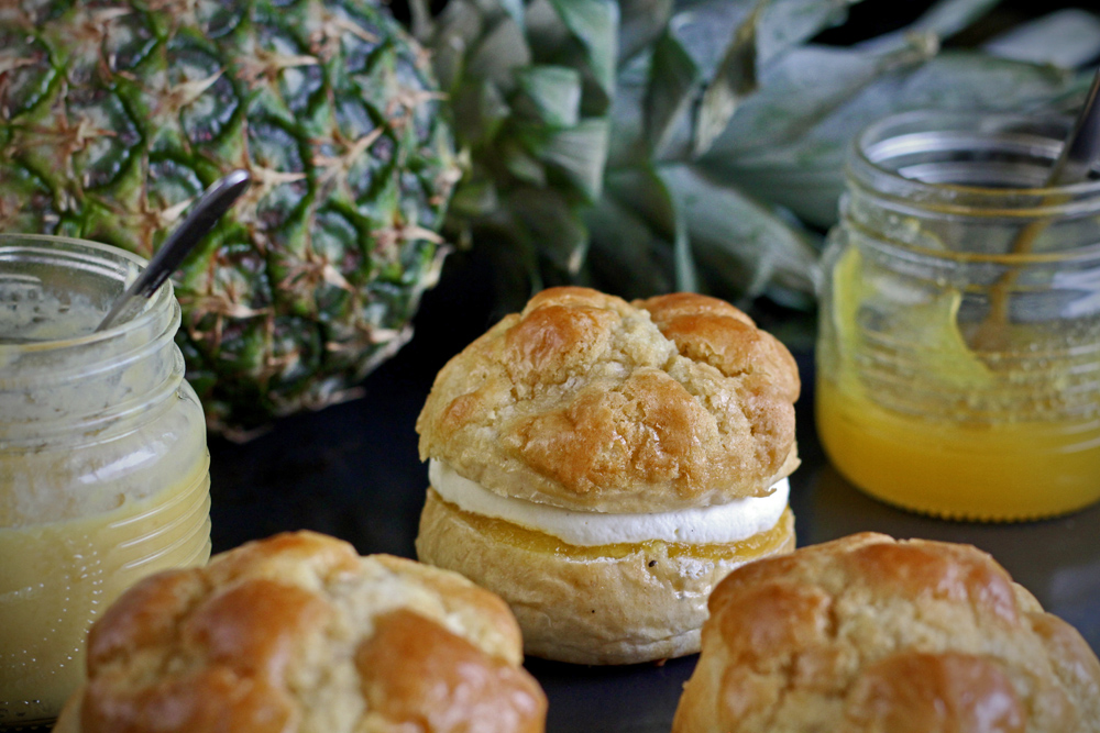 Ananasta muistuttava pinta sai keittämään ananashilloa ja ananastahnaa (Pineapple Curd). Ja koska laskiainen… pursotin väliin vaniljalla maustettua kermavaahtoa.
