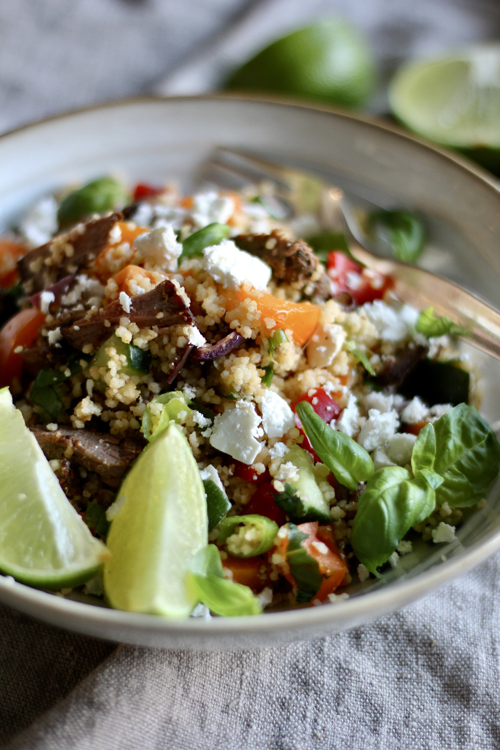 Olen maustanut kuskusin monta kertaa esimerkiksi yrttimausteilla ja chilirouheella. Jokin aika sitten silmiini osui kuitenkin ohje, jossa kuskuksen maustamiseen oli käytetty limetin raastettua kuorta. Päätin kokeilla, joskin niin että kuoren raastamisen osan vedestä korvasin limetin mehulla. Toimi, vieläpä niin hyvin että mun kuskussalaatit taitavat jatkossa syntyä pitkälti limetillä maustettuna.
