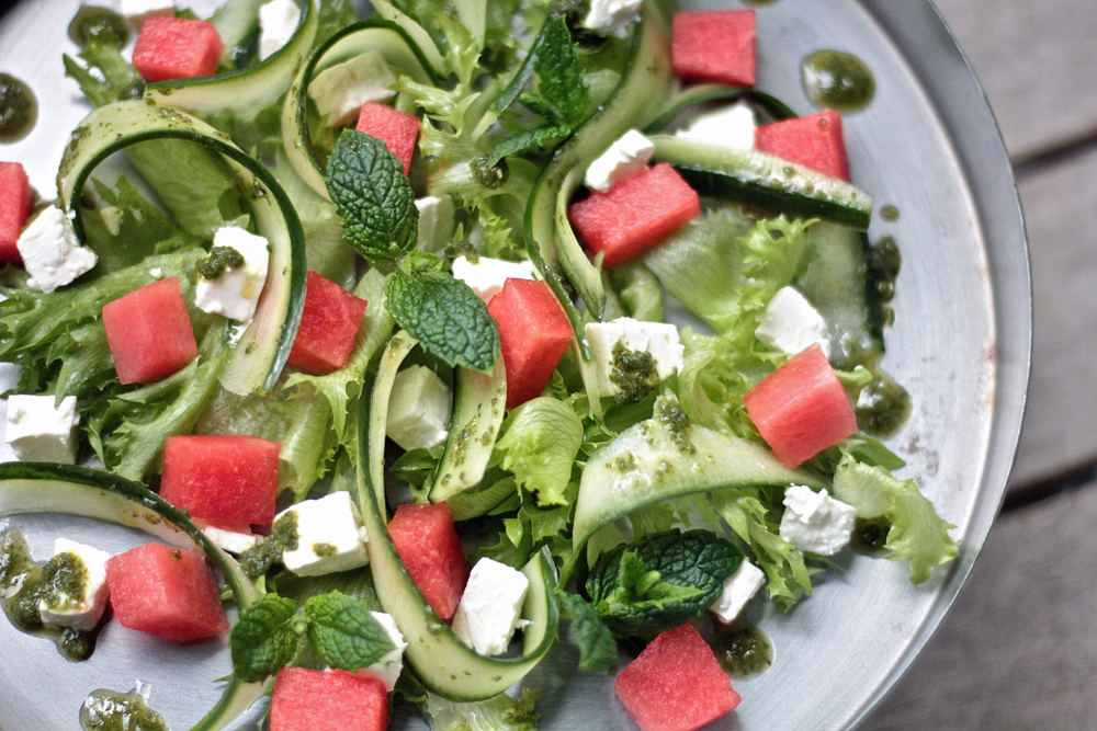 Salaatti saa näyttävyyttä, kun suikaloi kurkun pilkkomisen sijasta. Meloni-fetasalaatti maistuu mintusta tehdyllä salaatinkastikkeella. Fetan voi tarjota myös erikseen.