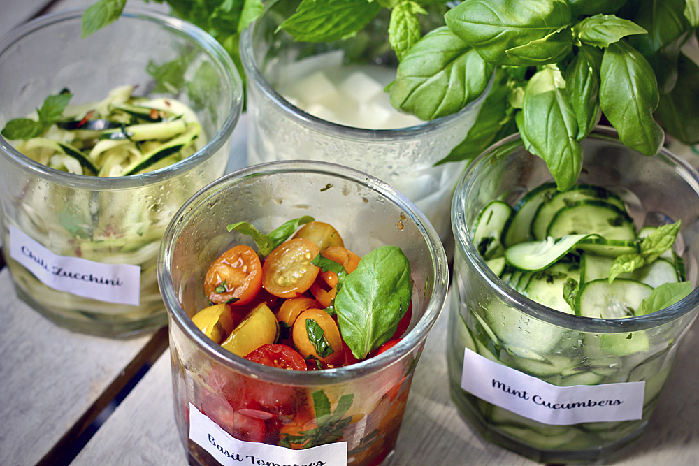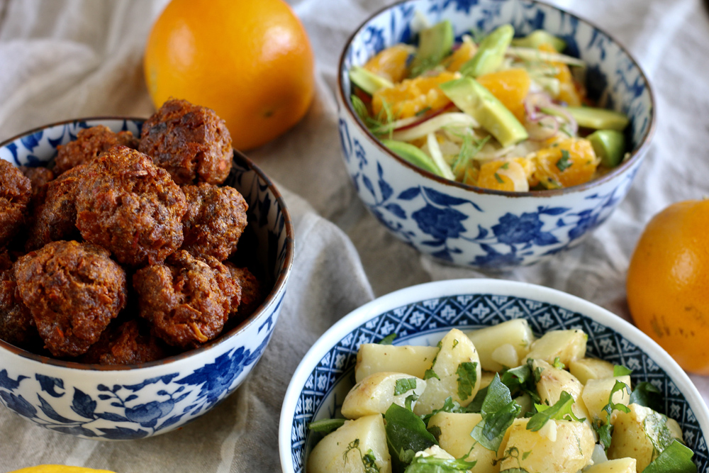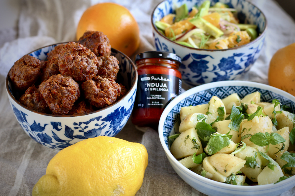 Eikä unohdeta lihapullia! Tällä kertaa lihapullat saivat makua Nduja-tahnasta ja sitruunasta (ohje sivun alalaidassa). Niiden kavereiksi sopivat esimerkiksi mintulla maustetut hölskykurkut, basilika-tomaatit, chili-kesäkurpitsa(nuudelit) ja feta.