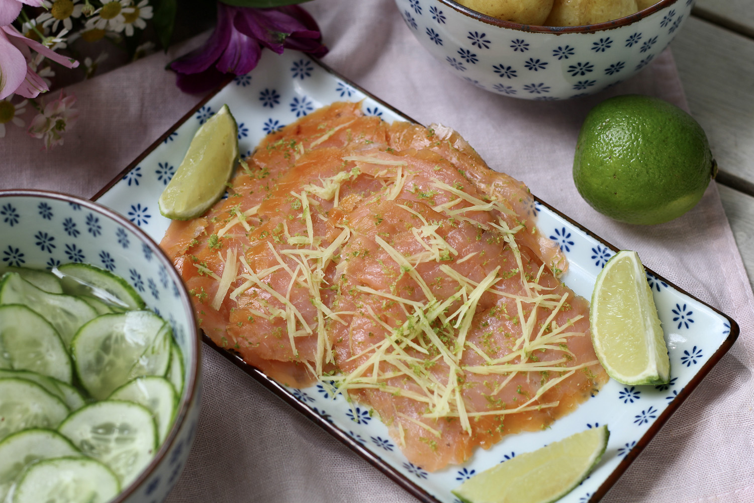 Limetin ja inkiväärin maustama graavilohi maistuu uusien perunoiden ja inkiväärillä maustetun kurkkusalaatin kanssa. Seuraksi sopii myös salaatti, jossa appelsiini ja avokado ovat saaneet kavereikseen pikapikkelöityä fenkolia (ohje sivun alalaidassa). Uusien perunoiden sijasta näiden kanssa maistuu myös esimerkiksi sitruunalla, rukolalla ja yrteillä maustetut perunat.