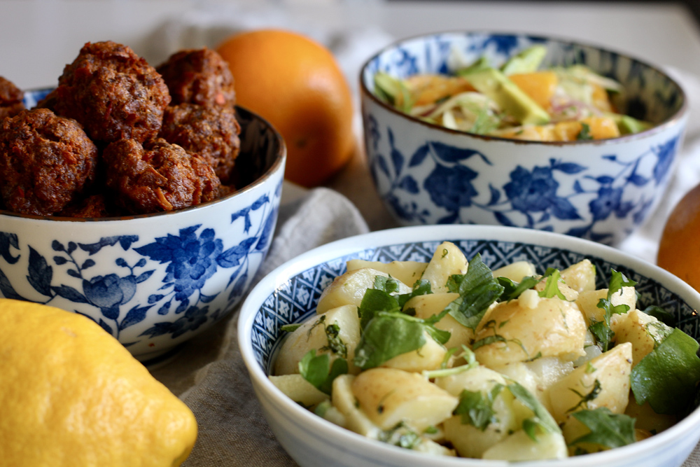 Eikä unohdeta lihapullia! Tällä kertaa lihapullat saivat makua Nduja-tahnasta ja sitruunasta (ohje sivun alalaidassa). Niiden kavereiksi sopivat esimerkiksi mintulla maustetut hölskykurkut, basilika-tomaatit, chili-kesäkurpitsa(nuudelit) ja feta.