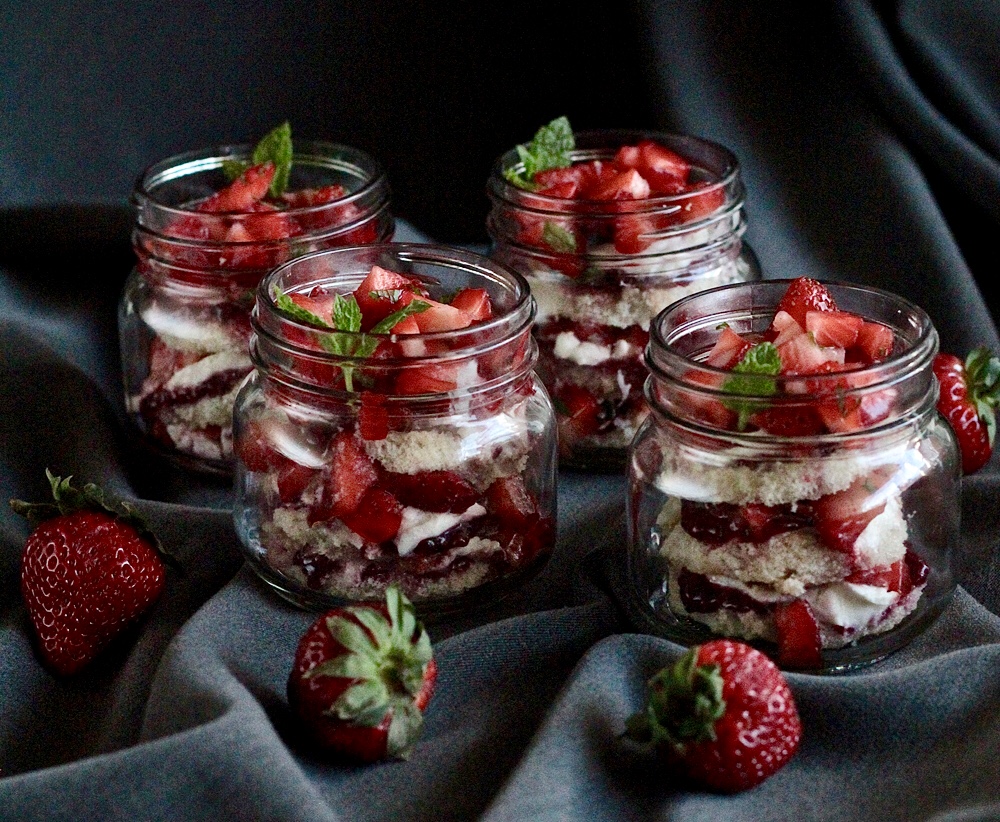 Raikas-mansikkakakku syntyy helposti valmiista gluteenittomasta kakkupohjasta. Tässä kakku on tehty lasipurkkeihin, mutta voit tehdä kakusta myös perinteisemmän version. Siinä tapauksessa varaudu miettimään, kuinka haluat koristella kakun, esimerkiksi tuleeko ostaa vispikermaa päälle levitettävää kermavaahtoa varten.
