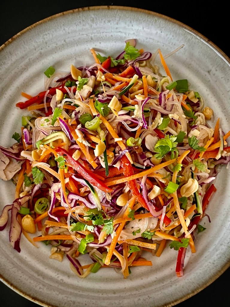 Raikas, rapsakka ja ruokaisa nuudelisalaatti syntyy milloin mistäkin. Anna omien mieltymysten ja kaapin sisällön päättää, mitkä ainekset maapähkinän ja chilin maustama kastike sitoo yhteen. Salaattia tehdessä kantavana ajatuksena oli lähinnä se, että keitettyä nuudelia oli jokseenkin yhtä paljon kuin pilkottuja kasviksia.