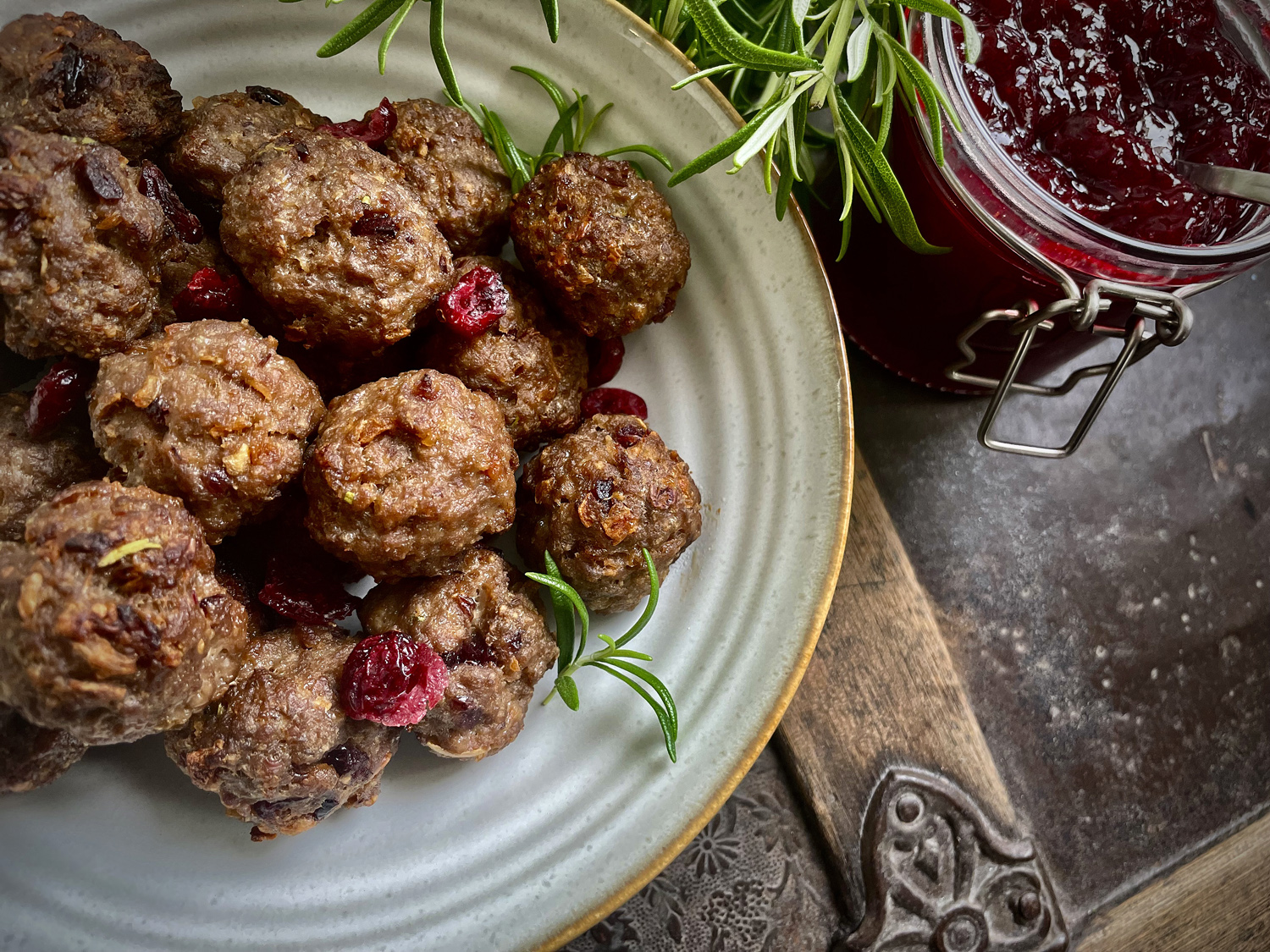 Karpalohilllo, kuivatut karpalot ja aavistus tuoretta rosmariinia maustoivat lihapullat, jotka sopivat syksyiselle aterialle kuin nenä päähän. Maistuvat niin syksyisen salaatin, paahdetun kurpitsan kuin perunasoseen kanssa.