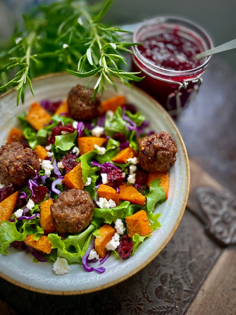 Voit tarjota lihapullat esimerkiksi paahdetun kurpitsan tai bataatin, salaatinlehtien, punakaalin, kuivattujen karpalojen ja fetajuuston kanssa.