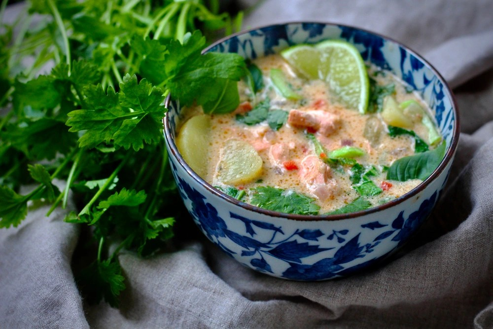 Aivan toisenlaiseen makumaailmaan vie Thaimaan inspiroima lohikeitto, jossa maistuu inkiväärin ja limetin lisäksi kookosmaito. Ihanan raikas ja mausteinen.