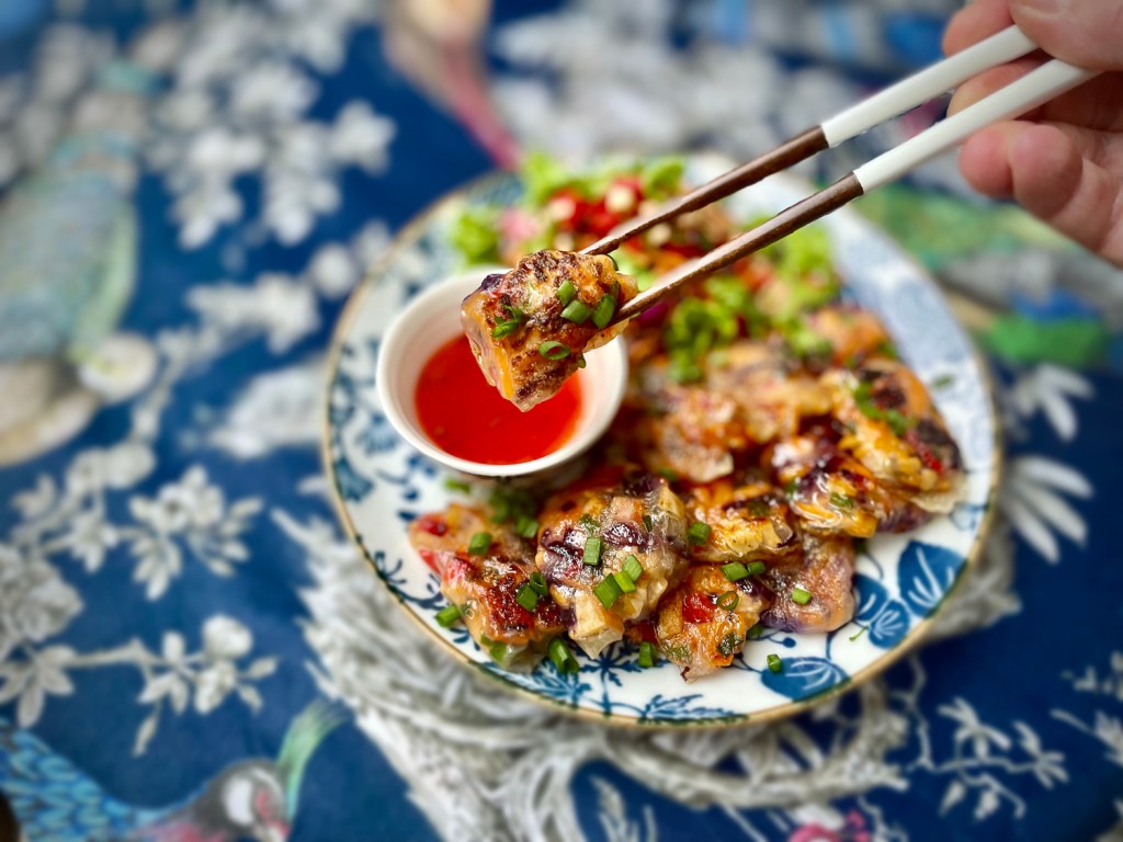 Valitse yksi tai useampi kastike tarjolle, esimerkiksi valmiista kastikkeista makeaa chilikastiketta, tulista sriracha-kastiketta ja/tai soijakastiketta.