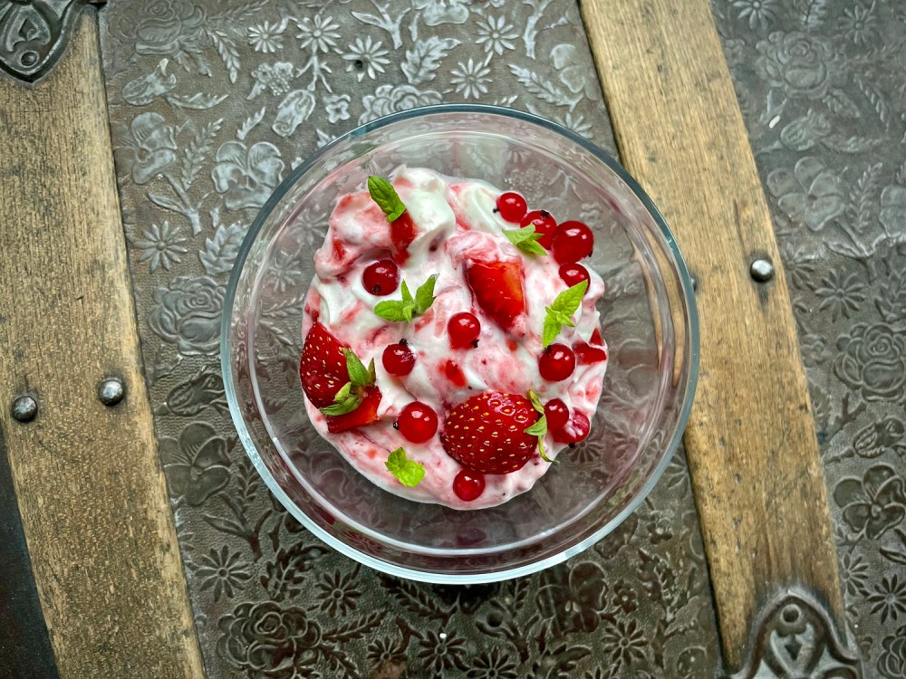 - Vatkaa kerma vaahdoksi ja sekoita joukkoon jogurtti. Lisää sokeria maun mukaan.