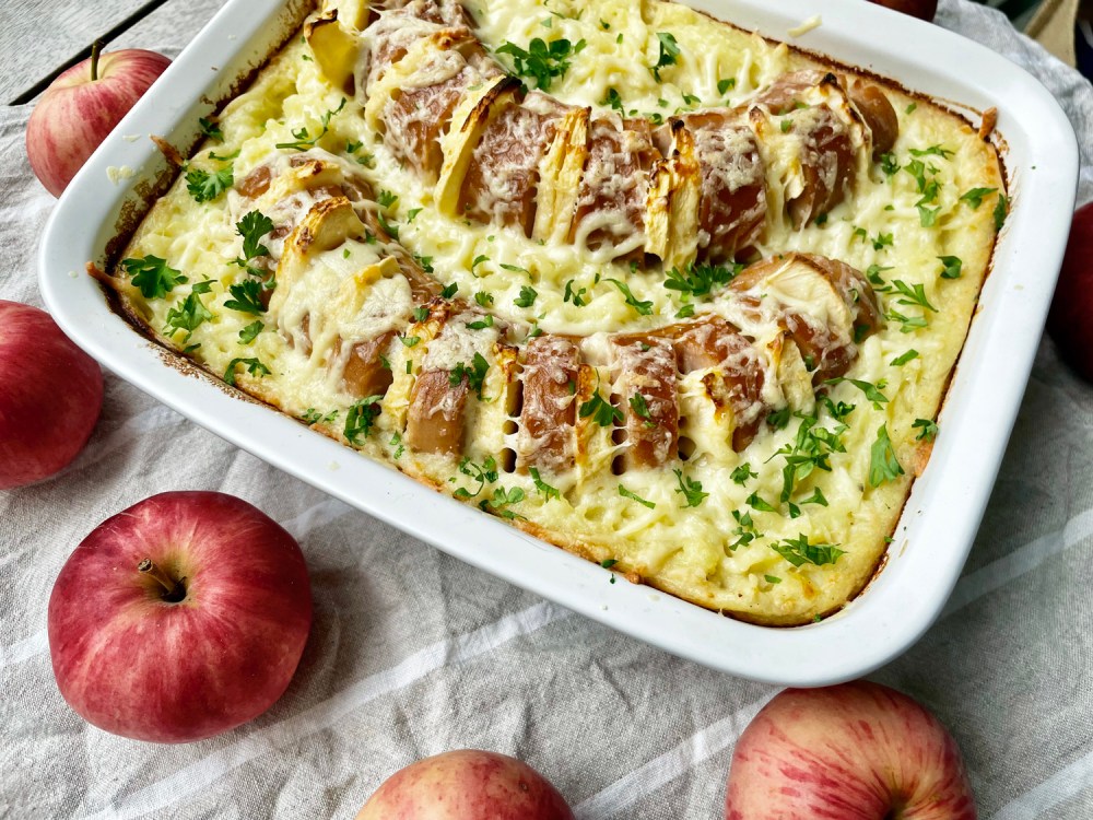 - Ota vuoka uunista ja sekoita joukkoon juusto- ja omenaraaste sekä ripaus muskottia.